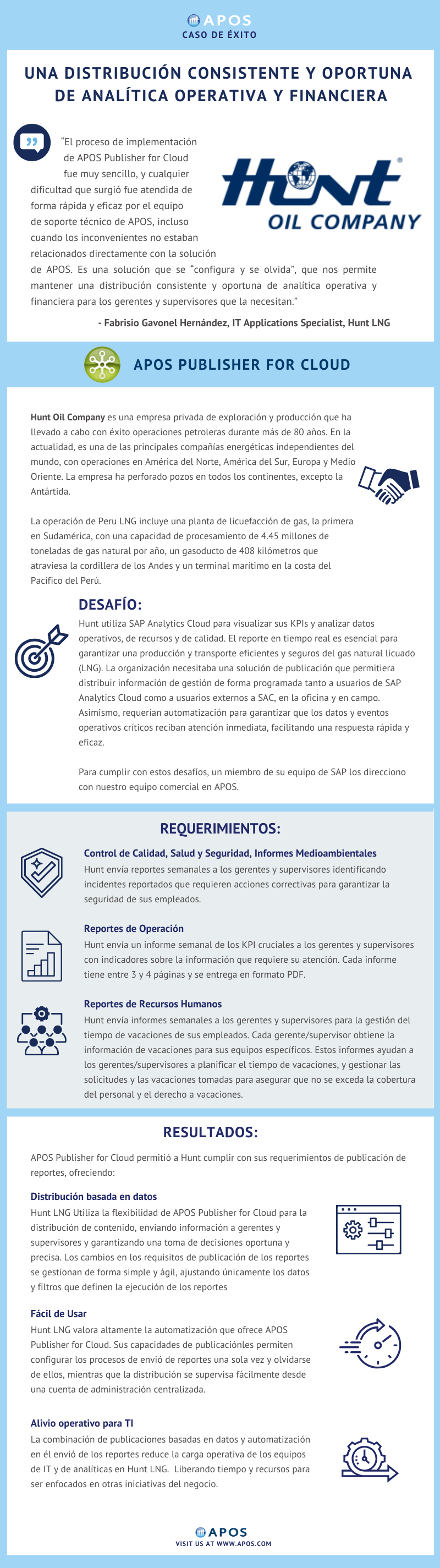 Hunt LNG Utiliza la flexibilidad de APOS Publisher for Cloud para la distribución de contenido, enviando información a gerentes y supervisores y garantizando una toma de decisiones oportuna y precisa. Los cambios en los requisitos de publicación de los reportes se gestionan de forma simple y ágil, ajustando únicamente los datos y filtros que definen la ejecución de los reportes.