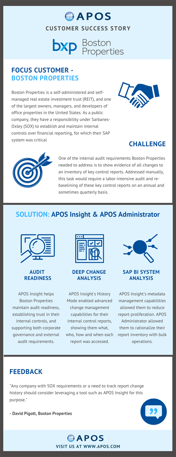 Boston Properties is a self-administered and self-managed real estate investment trust (REIT), and one of the largest owners, managers, and developers of office properties in the United States. As a public company, they have a responsibility under Sarbanes-Oxley (SOX) to establish and maintain internal controls over financial reporting, for which their SAP BusinessObjects system was critical.